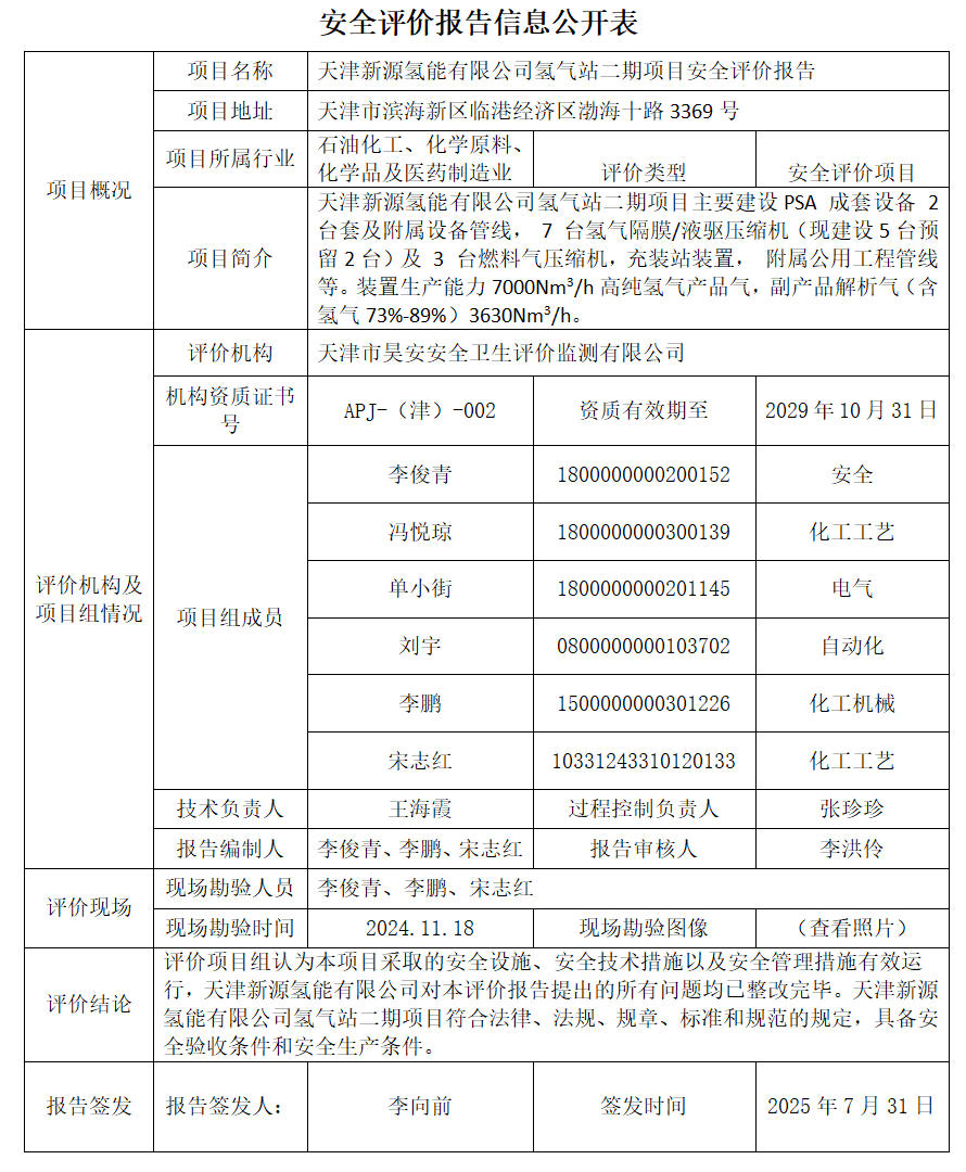 天津新源氢能有限公司氢气站二期项目安全评价报告