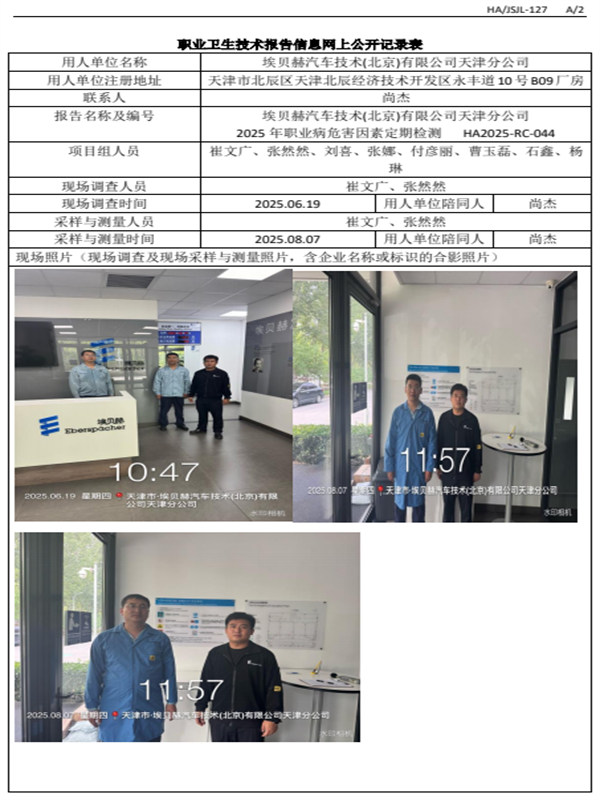 埃贝赫汽车技术(北京)有限公司天津分公司 2025年职业病危害因素定期检测