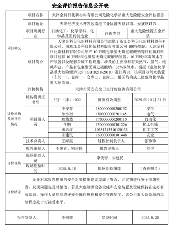 天津金科日化新材料有限公司危险化学品重大危险源安全评估报告
