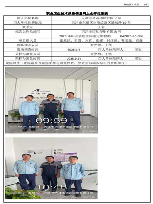 天津市诺达印刷有限公司 2025年职业病危害因素定期检测
