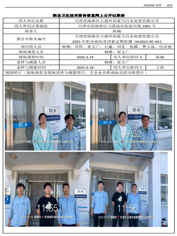 天津滨海新区大港环科蓝天污水处理有限公司 2025年职业病危害因素定期检测