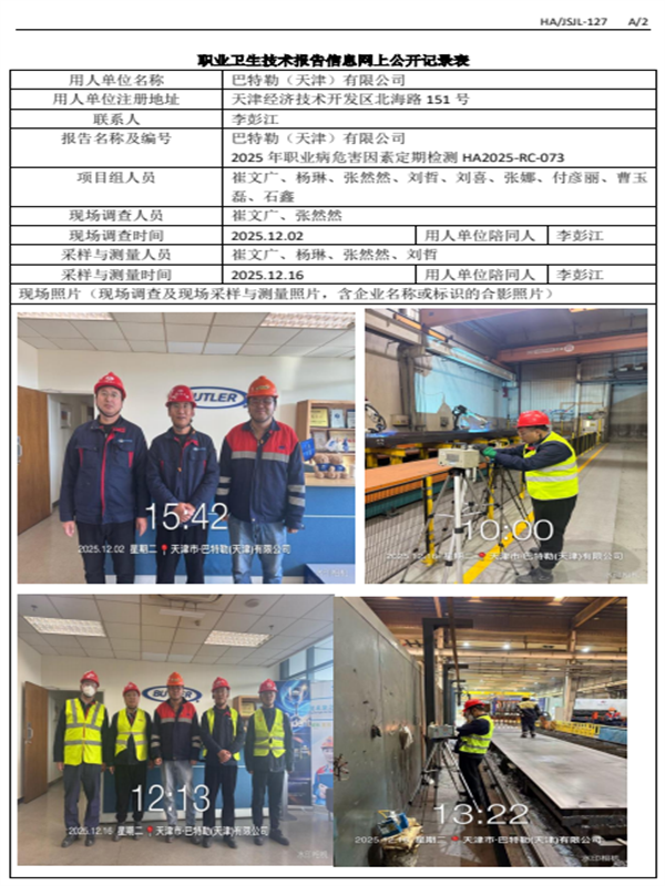 巴特勒(天津)有限公司 2025年职业病危害因素定期检测